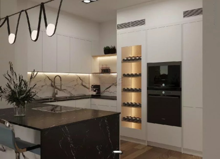 Апартаменты расположены на берегу реки Шпрее в Берлине.Апартаменты площадью 112 кв. м включают 2 спальни, полностью оборудованную кухню с островом, гостиную и столовую открытого плана, террасу с садом и открытое парковочное место. В апартаментах панорамные окна с видом на реку. Техническое оснащение включает подогрев полов.