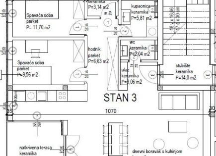 Продажа квартир в новостройке, Канфанар! Здание с 8 квартирами состоит из 3 этажей: цокольного, первого и второго этажей. Квартира А3 расположена на первом этаже здания и состоит из следующих помещений: гостиная + кухня 39,82 м2 прихожая 3,06 м2 коридор 6,63 м2 туалет 2,04 м2 комната 3,14 м2 ванная комната 5,81 м2 спальня 9,56 м2 спальня...