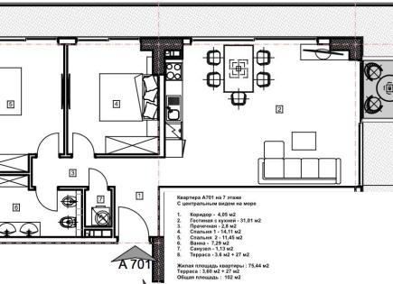 Код объекта - 1.30.13.8151 Пентхаус с 2 спальнями A701,9 этаж, жилая площадь 75,44 м2 + 27 м2 терраса(общая площадь: 102,44 м2).Квартира с просторной гостиной, столовой зоной, двумя спальнями, одной ванной комнатой, гардеробом, подсобным помещением, а также террасойсвидом на море, Старый город и панораму города. Взависимости от того сколько...