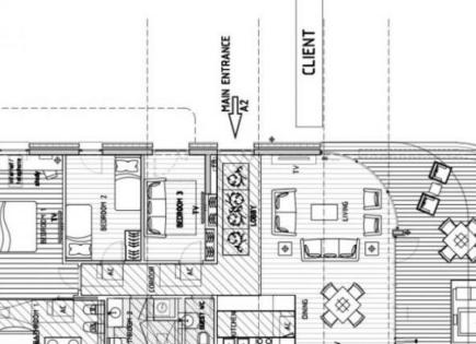 № 4461. Рафаиловичи. Квартира на 3-м этаже класса "люкс" в первой линии моря - 10 метров от пляжа. Площадь 230 кв м: три спальных комнаты (25.68m2, 20.13m2, 17.50m2); три ванные комнаты (10.88m2, 5.48m2, 3.00m2); гостиная с кухней-столовой 70,68 м2; терраса 54,52 м2; три вспомогательных помещения - гардеробные и т.д. (7.23m2, 3.58m2,...