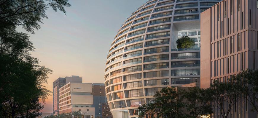 Сферическая форма, которую Вини Маас из MVRDV сравнил с мячом и храмами просвещения, максимально эффективно использует плотность застройки. Здание сужается к основанию, образуя просторные общественные зоны, и сужается к вершине, формируя террасы для жителей с панорамным видом на Тирану.