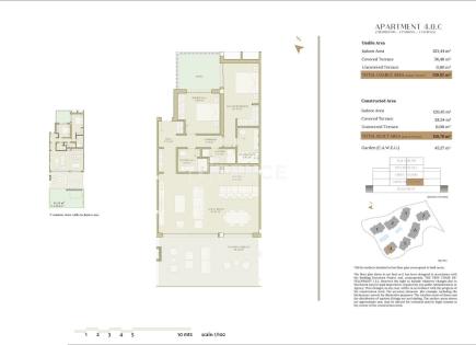 Площадь квартиры 136 м2: 3 спальни, 2 санузла, гостиная с открытой кухней, 2 большие крытые террасы площадью 62 м2 с видом на море, еще одна открытая терраса площадью 39 м2 и большой солярий (95 м2) с видом на море.